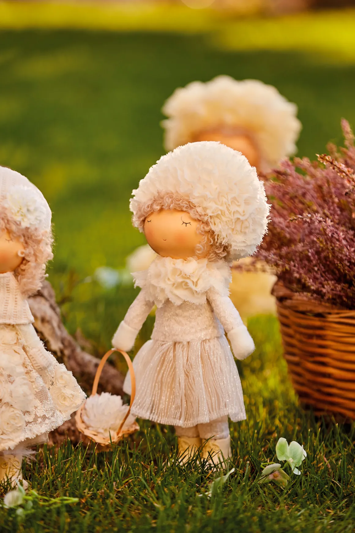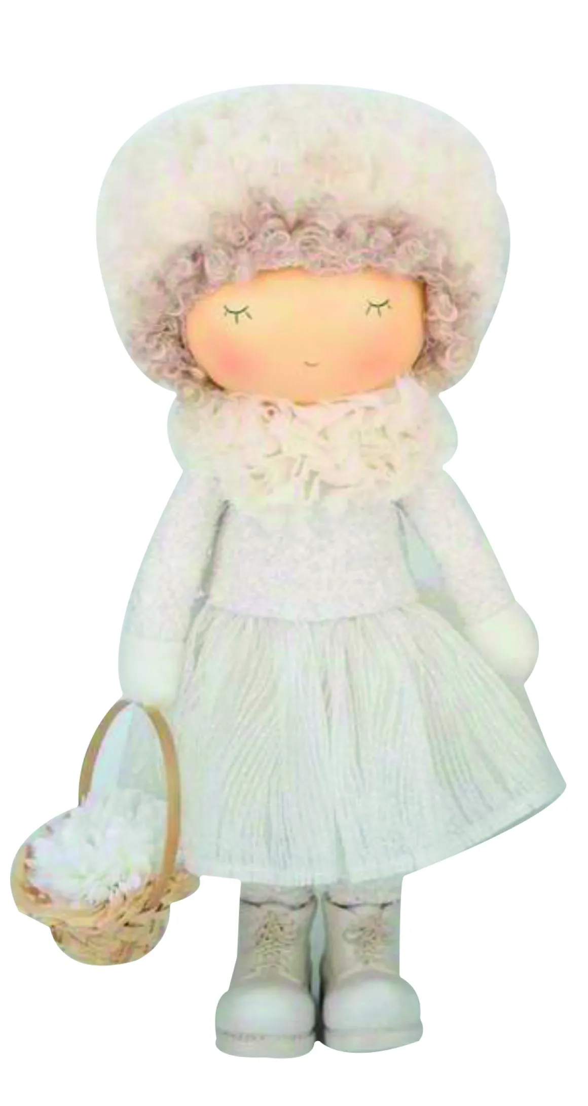 Bambola decorativa in piedi con cappello e collo in organza, gonna bianca in tulle lavorato glitterato e cestino con fiori mod.MILLY