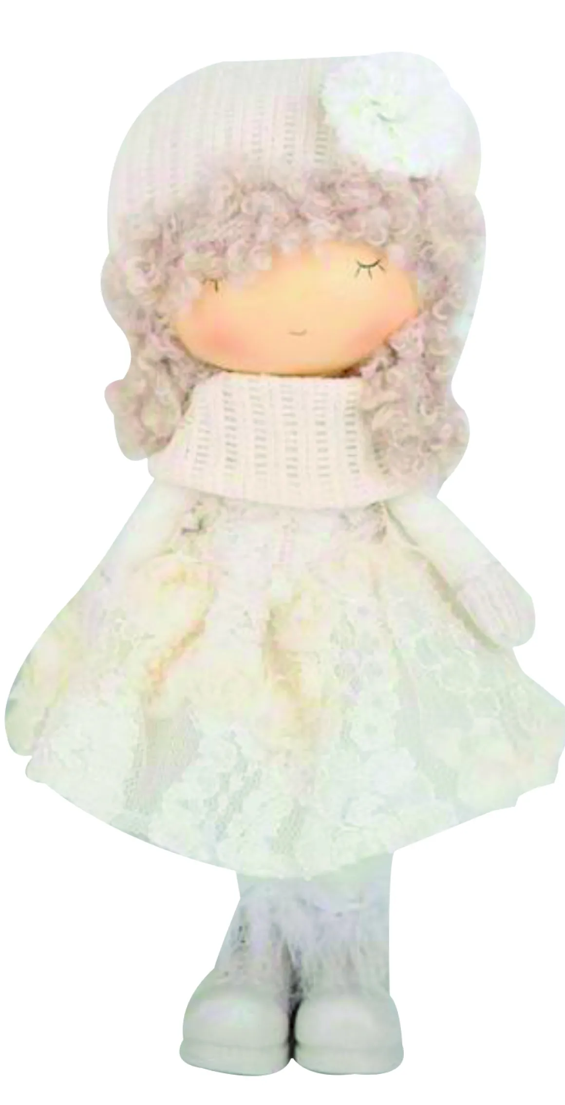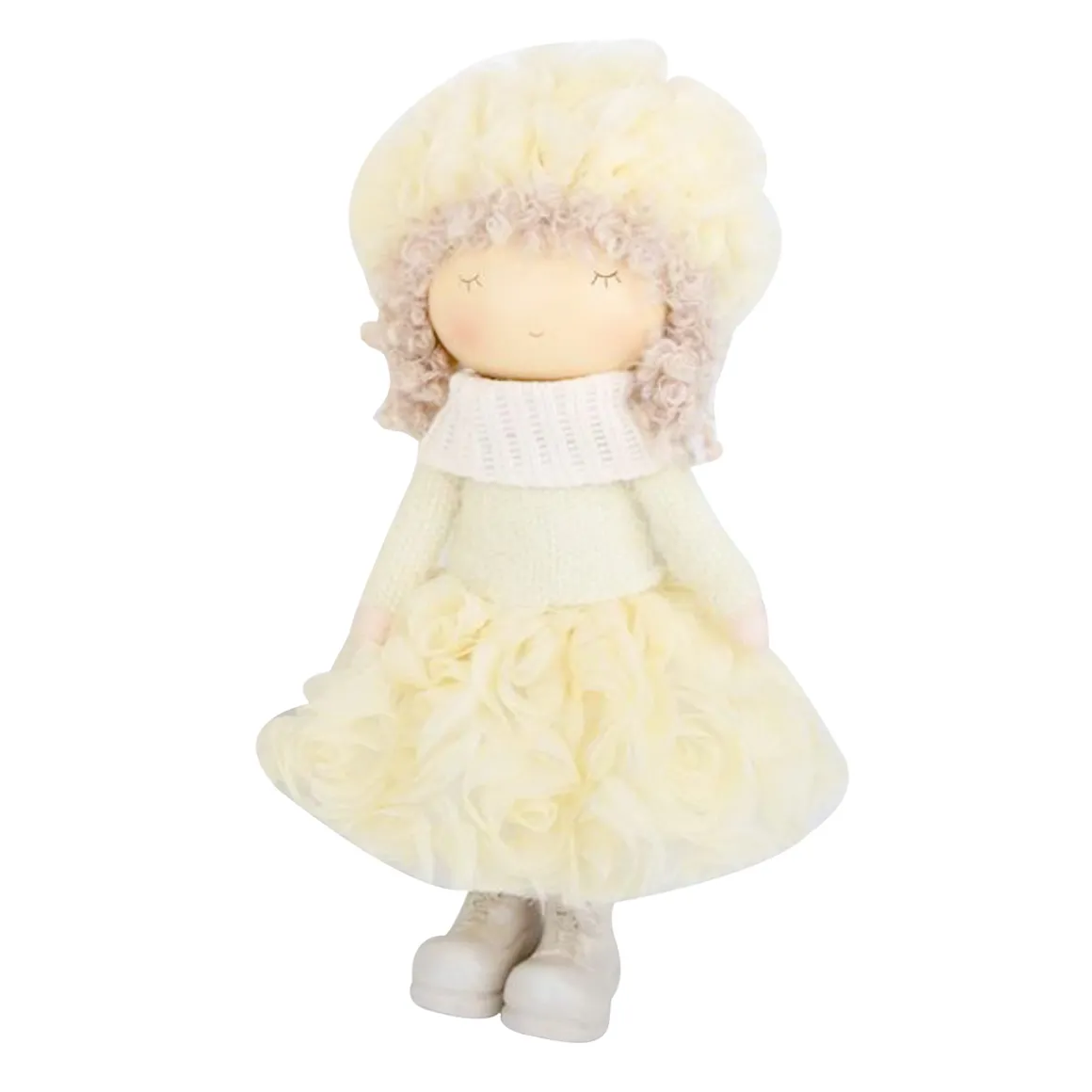 Bambola decorativa in piedi con capello e collo in maglia, vestito in tulle ricamato e roselline in rilievo