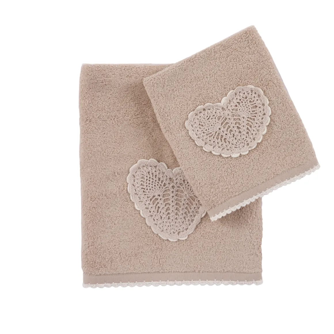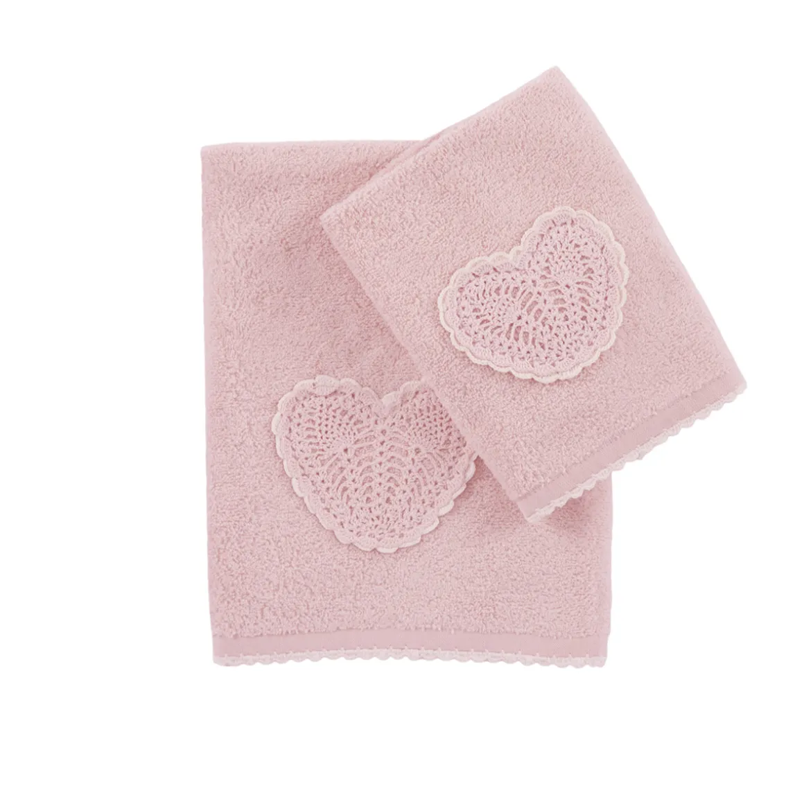 Pregiato set di asciugamani per il bagno in morbida spugna con applicazioni crochet, custoditi in un ricercato ed elegante sacchetto in organza.