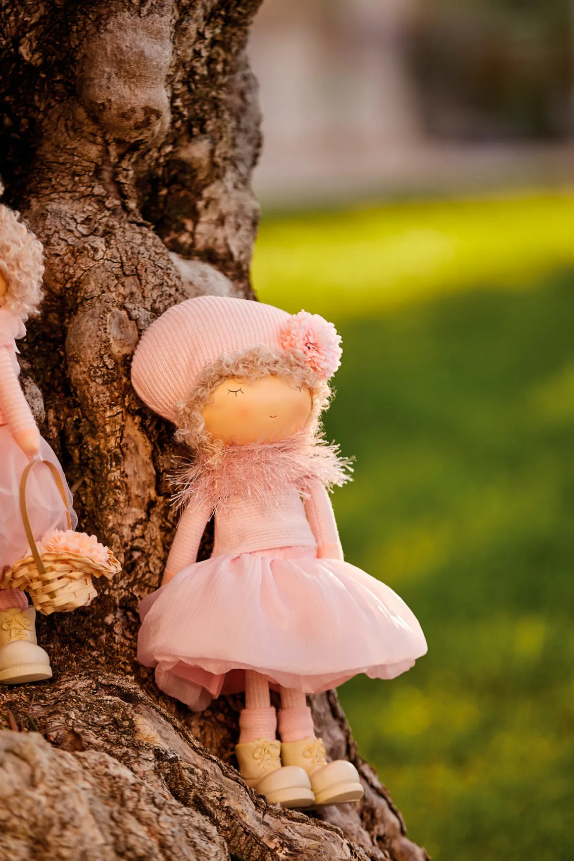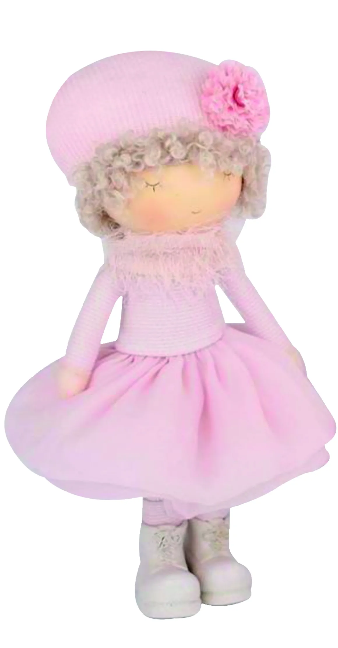 Bambola decorativa in piedi con cappello, collo charleston e gonna a nuvola rosa mod.JILLY