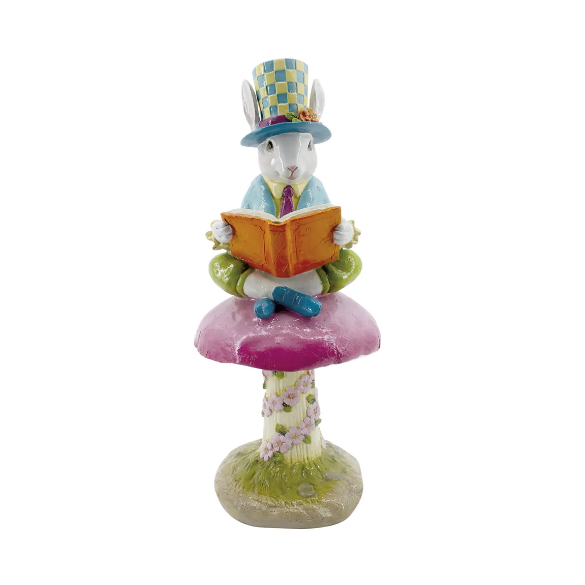 Bianconiglio in Wonderland seduto che legge su un fungo lavorato a mano