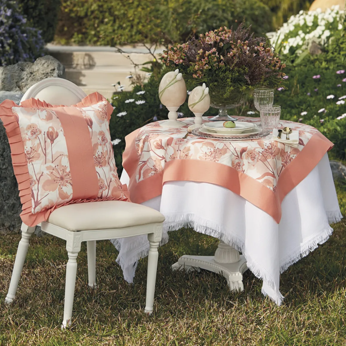 Questo centrotavola in lino e cotone con stampa floreale digitale ed orlo a giorno rientra nella linea cucina Melissa di Preziosa Luxury Home. Il centrotavola Melissa grazie alle delicate tonalità del rosa pesca o delle più neutre tonalità del tortora porta in casa l’allegria e la spensieratezza della primavera.