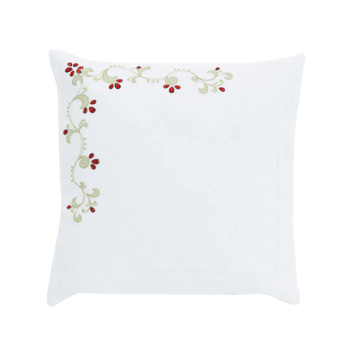 Copricuscino d’arredo con zip con decoro ricamato impreziosito da pietre cucite a mano e orlo a giorno