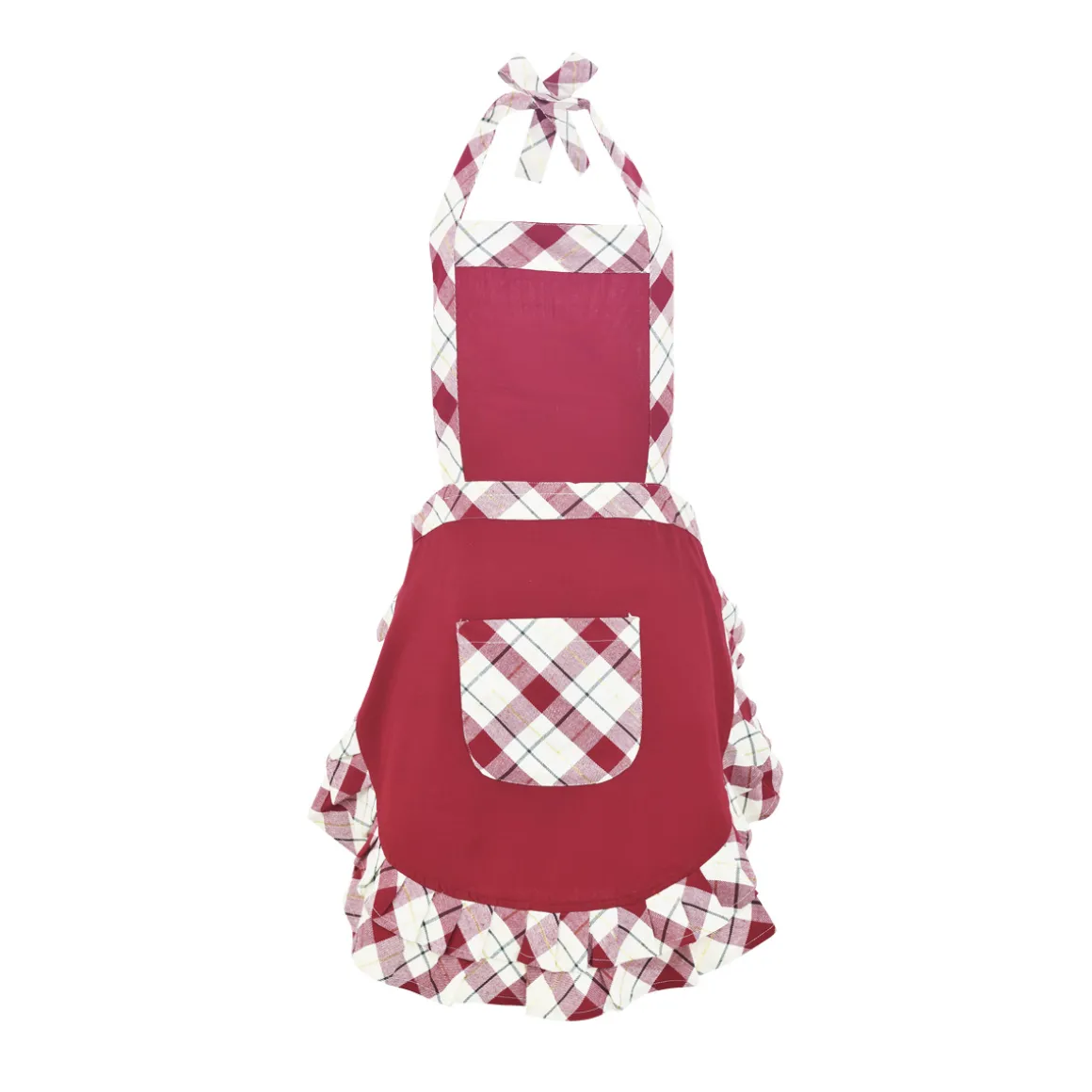 Grembiule con pattina con doppio bordo applicato a quadri e filo lurex oro disponibile in colore rosso o panna. Lavorato a mano e 100% cotone ,questo grembiule da cucina fa parte della Christmas Collection di Preziosa Luxury Home ideale per il tuo Natale