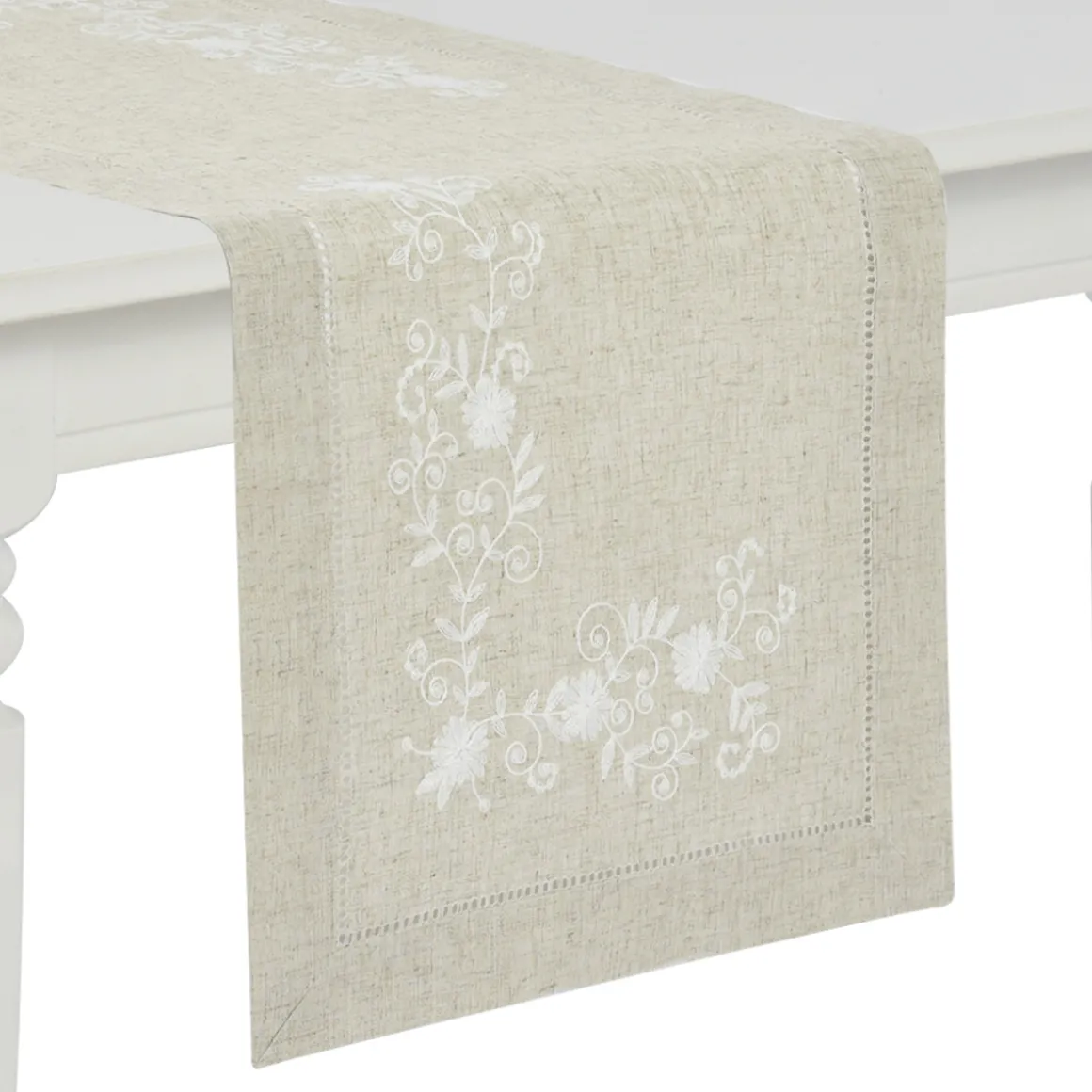 Runner con ricamo orlo a giorno punto lana piazzato lavorato a mano.