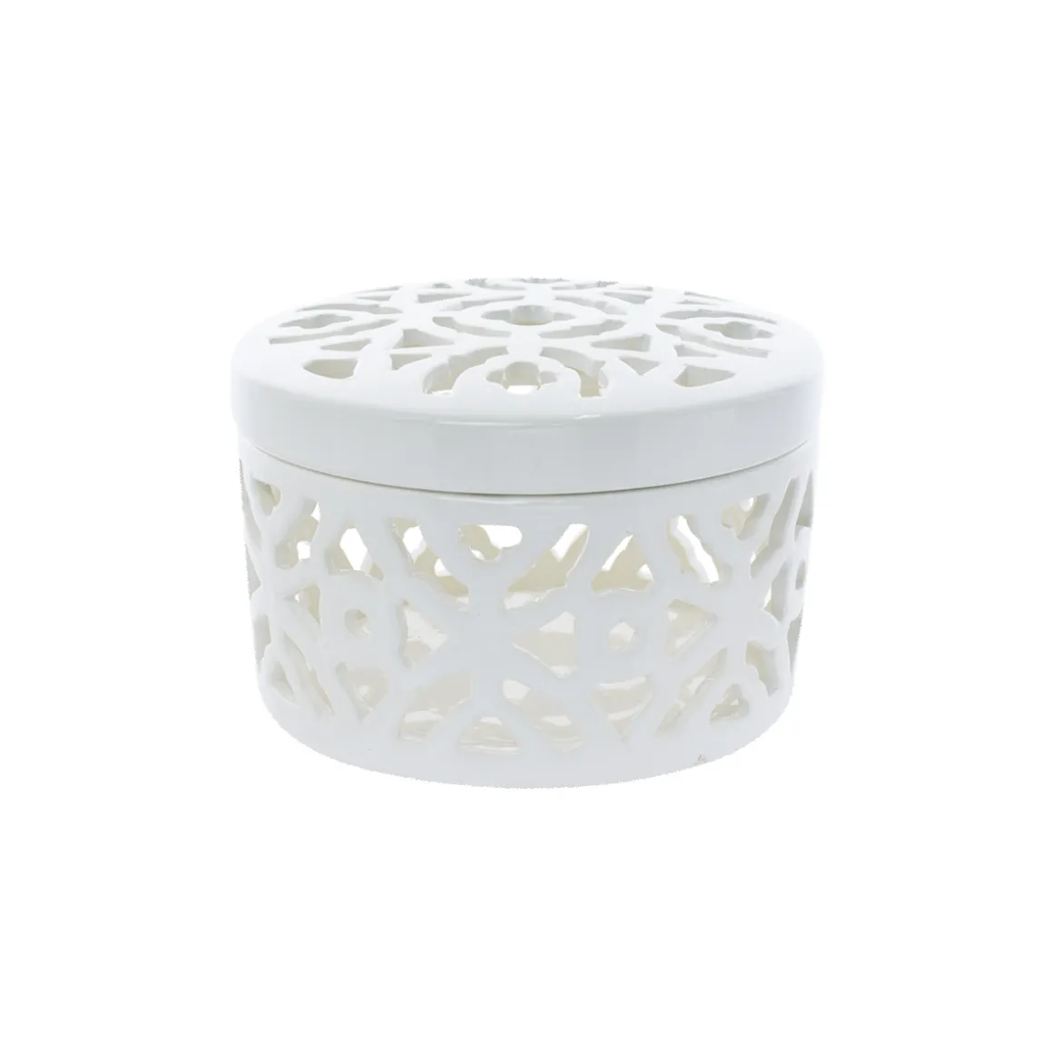 Scatola in porcellana bianca traforata lavorata a manornDimensioni: cm 20×13,5