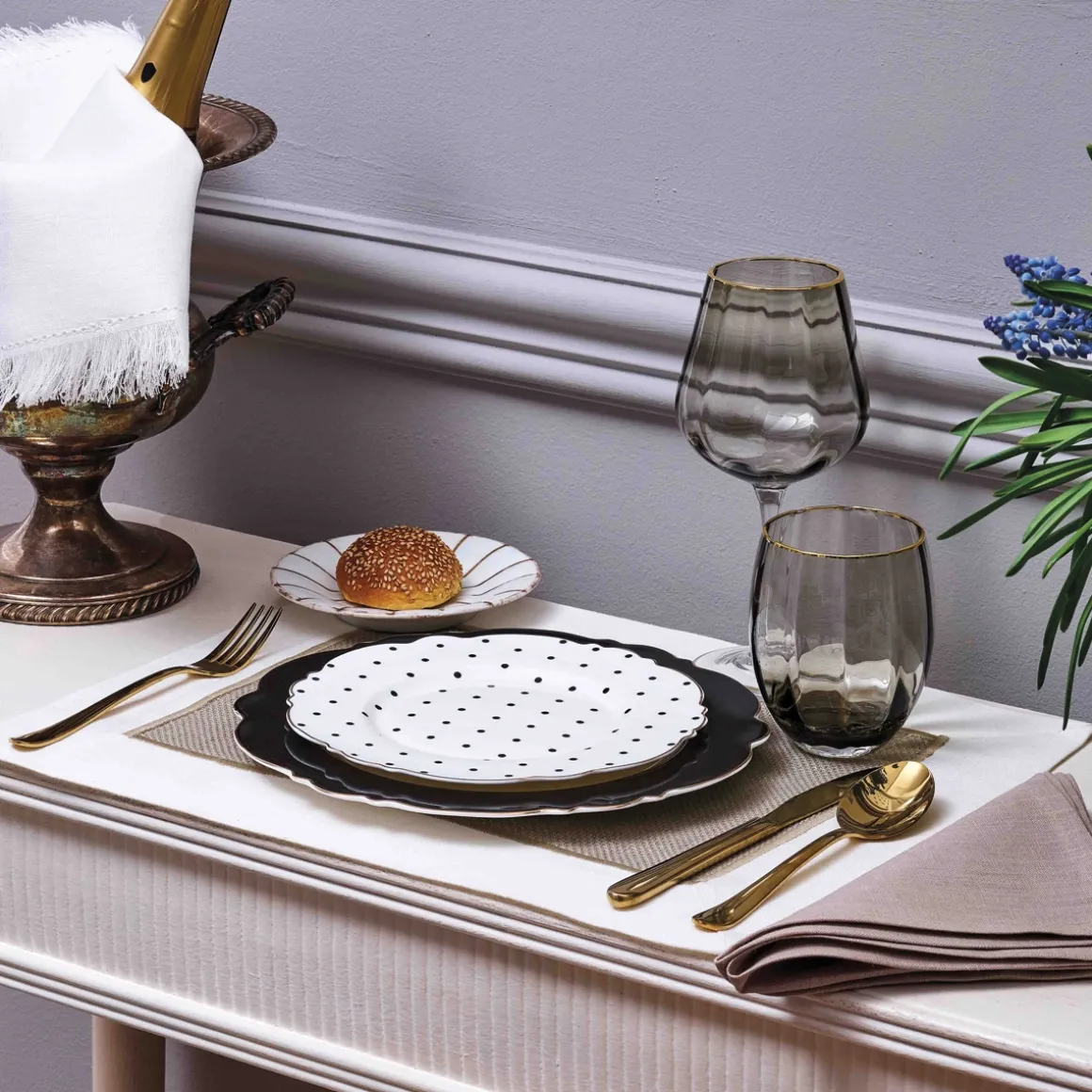 Questo set di 2 calici in vetro fumè grigio con profilo in oro rientra negli articoli di Preziosa Luxury Home per comporre una mise en place raffinata e di stile. I calici da vino in vetro, dallo stile inconfondibile e dal design sempre attuale, sono indispensabili per arricchire la tavola ed avere una mise en place perfetta in ogni occasione.
