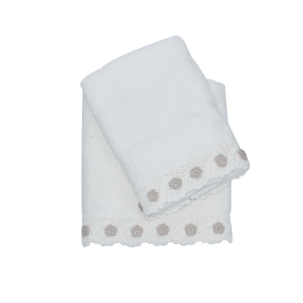 Set di asciugamani per il bagno in morbida spugna arricchito da ricami lavorati a mano in crochet. Questi asciugamani, racchiusi in un elegante sacchetto in organza, diventeranno presto elementi indispensabili della vostra biancheria da bagno.