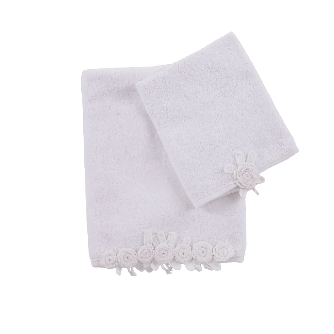 Pregiato set di asciugamani per il bagno in morbida spugna con applicazioni crochet, custoditi in un ricercato ed elegante sacchetto in organza.