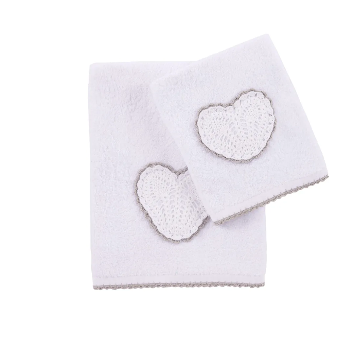 Pregiato set di asciugamani per il bagno in morbida spugna con applicazioni crochet, custoditi in un ricercato ed elegante sacchetto in organza.
