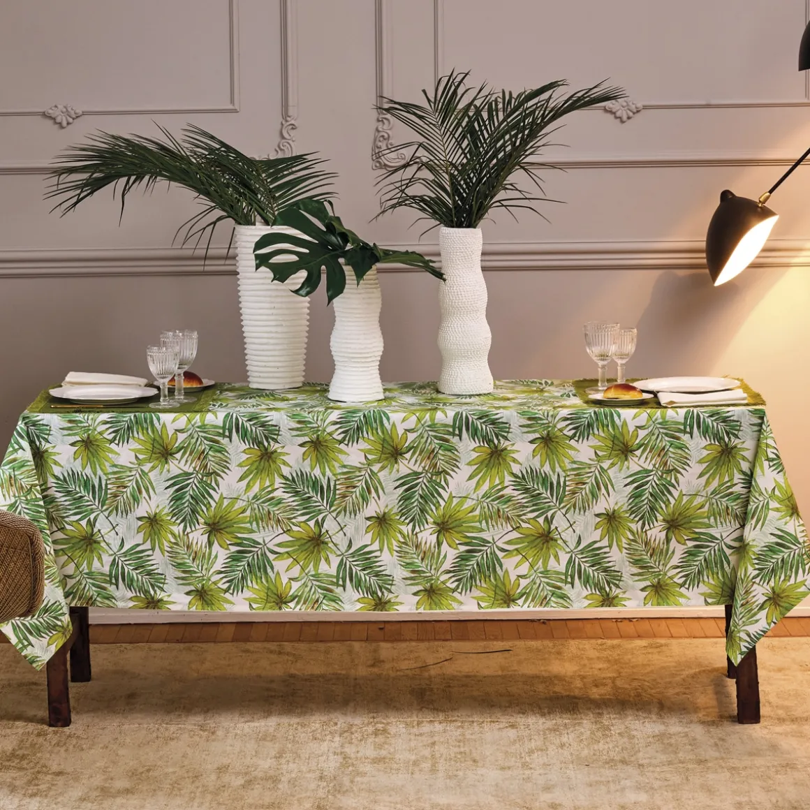 Questa tovaglia in lino e cotone con stampa ad ispirazione giungla tropicale rientra nella linea cucina Tropical di Preziosa Luxury Home. La tovaglia Tropical unisce l’eleganza e la raffinatezza del lino a stampe ispirate alla giungla tropicale. Grazie a questo tappeto verde di foglie, la tovaglia Tropical ricorda il rumore della giungla ricreando in casa paesaggi caraibici e un ambiente pieno di vita e colore.