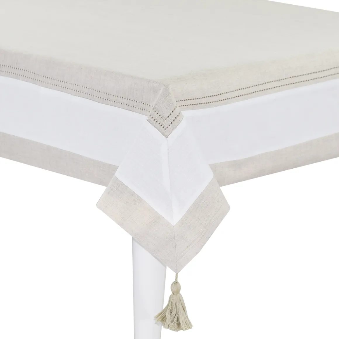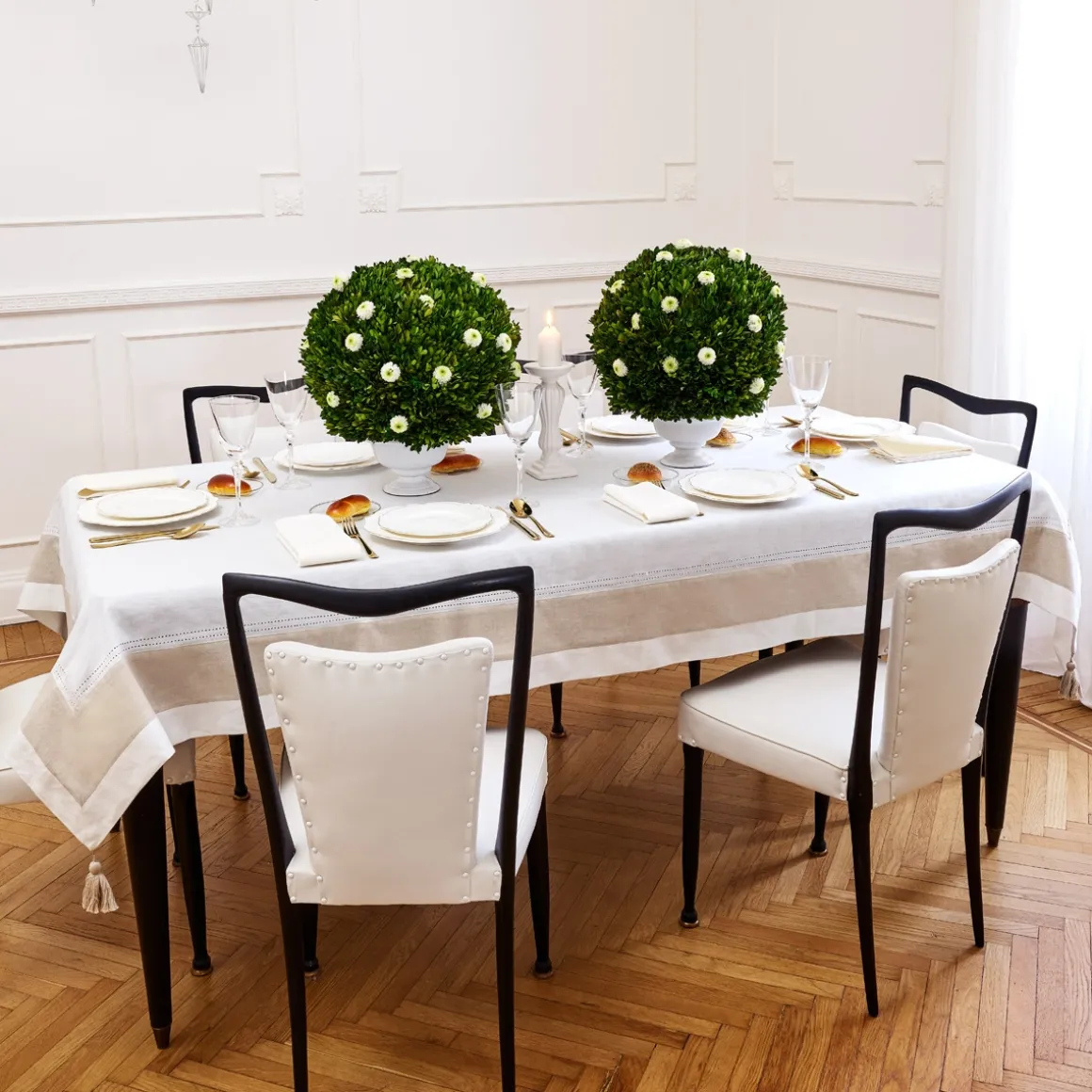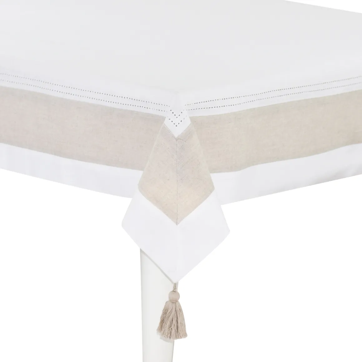 Questa tovaglia in cotone con balza in lino rientra nella linea cucina Tres Chic di Preziosa Luxury Home. La tovaglia Tres Chic è impreziosita dall’orlo a giorno, dalla balza in lino e dalle nappine. Minimale ed elegante, è perfetta per ogni ambiente e si sposa ad ogni gusto.