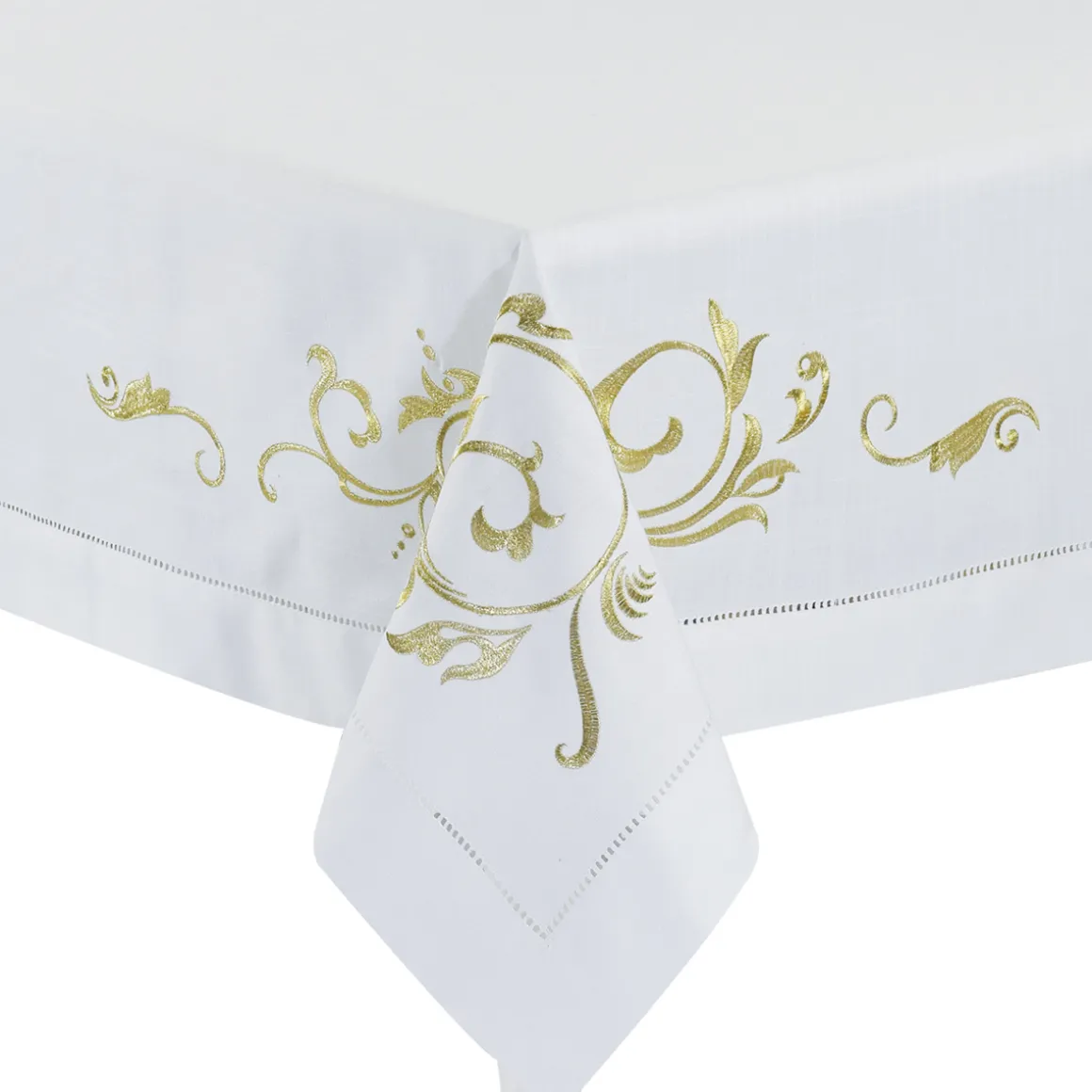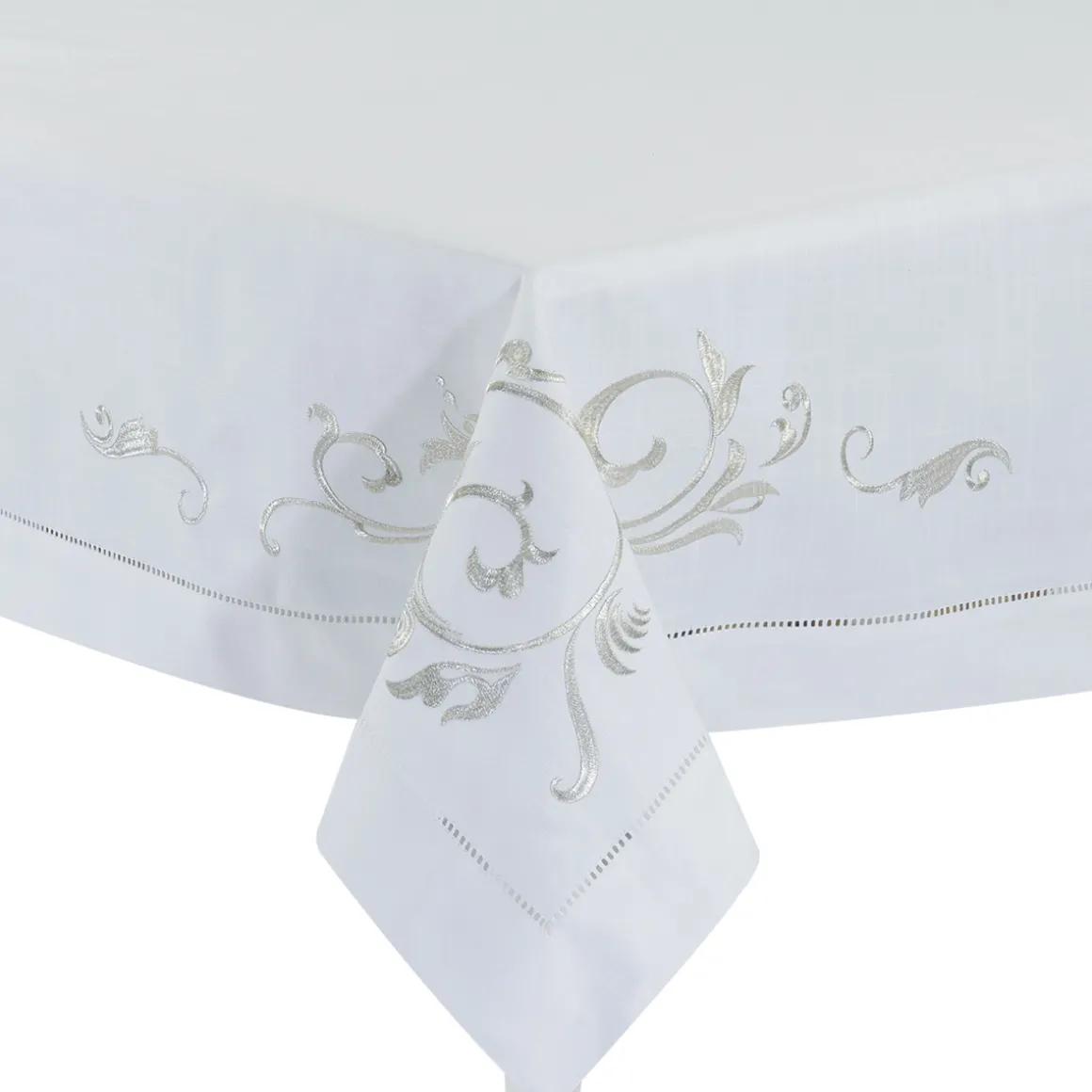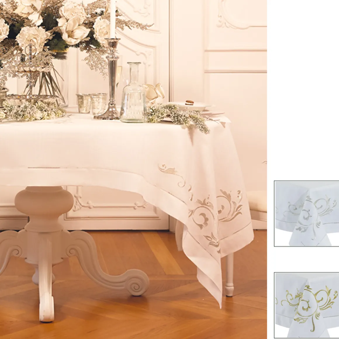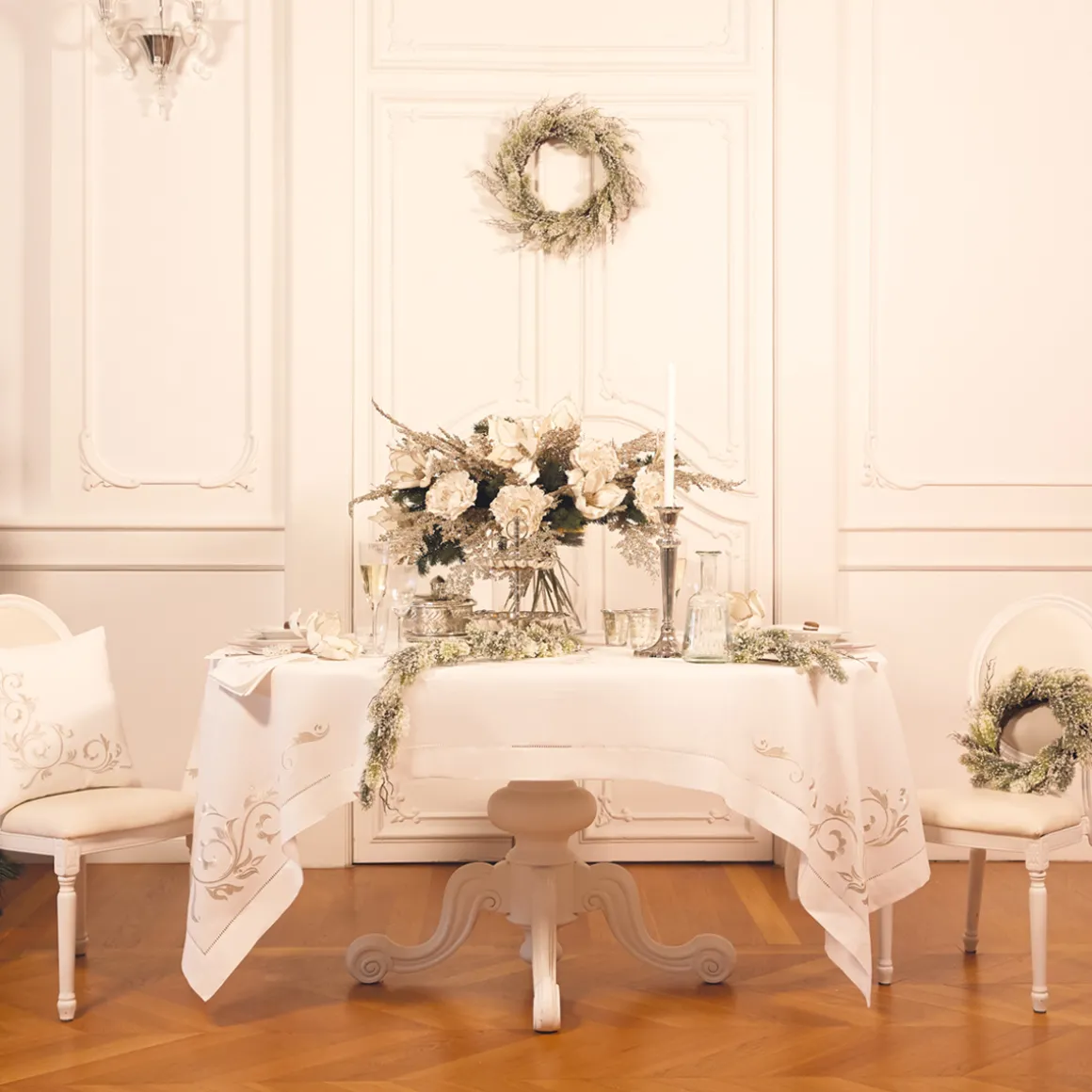 Questa tovaglia lavorata a mano con ricami in colore oro o argento, bordo applicato e orlo punto a giorno rientra nella linea Leggiadrie di Preziosa Luxury Home. La tovaglia Leggiadrie, grazie all’elegante e ricercato ricamo dona un tocco di luce alla tua tavola.
