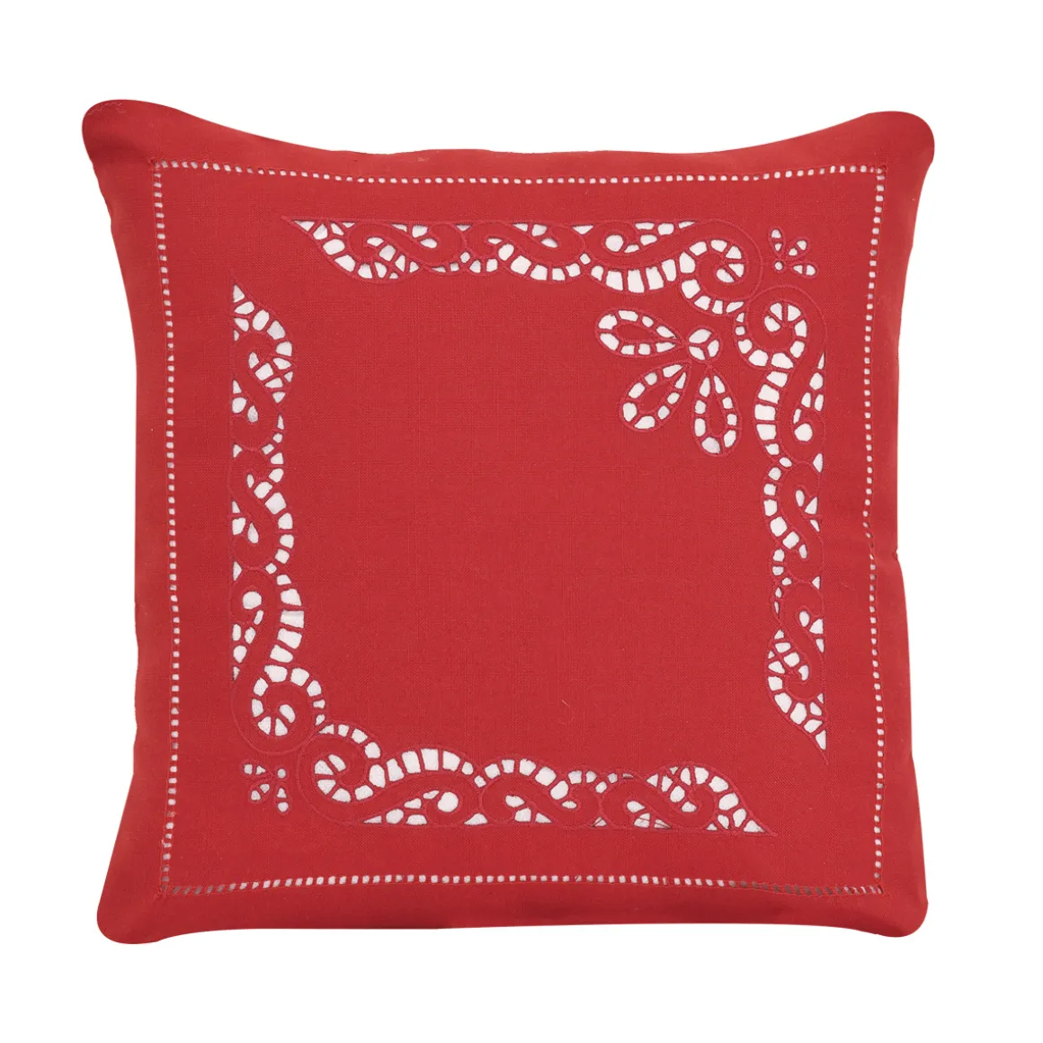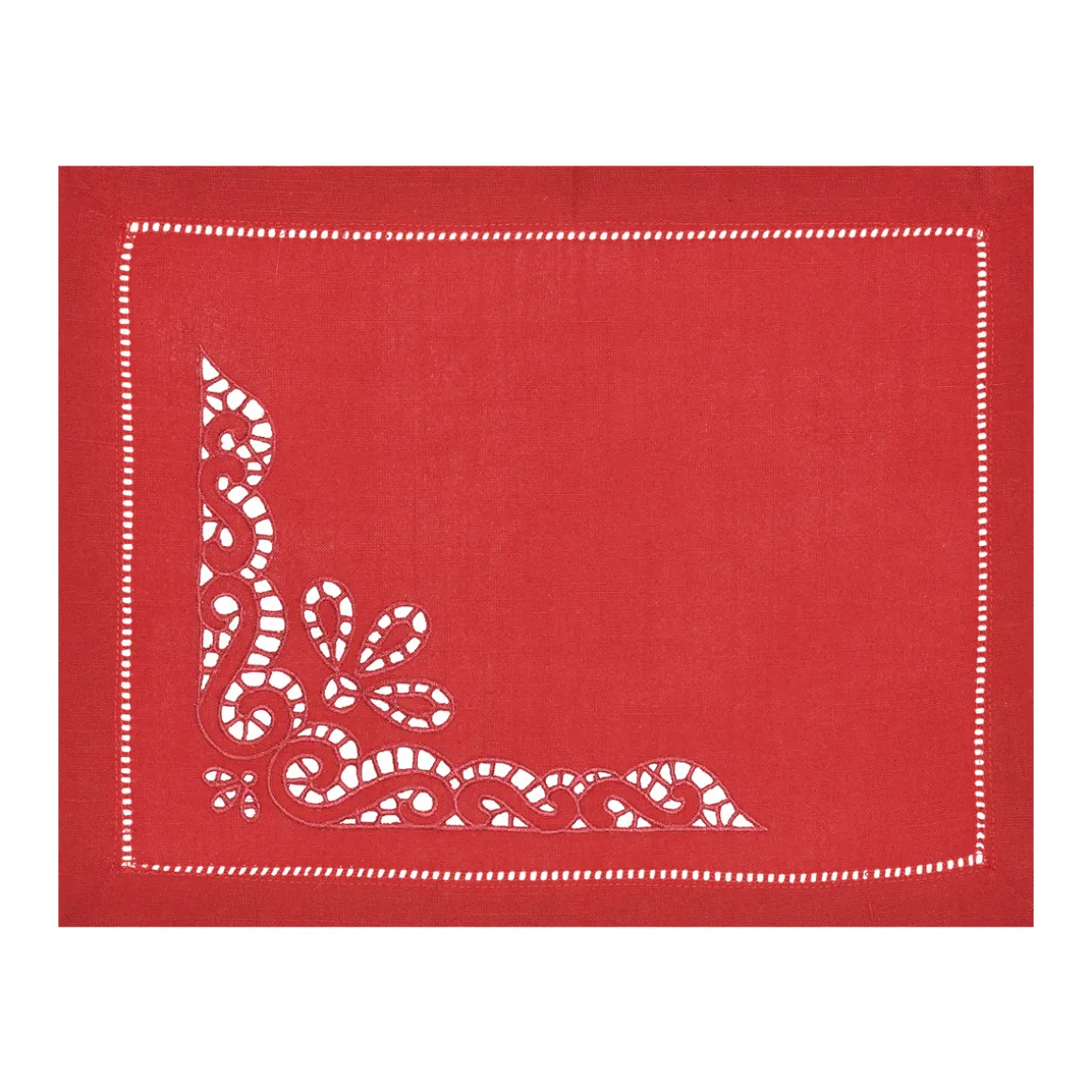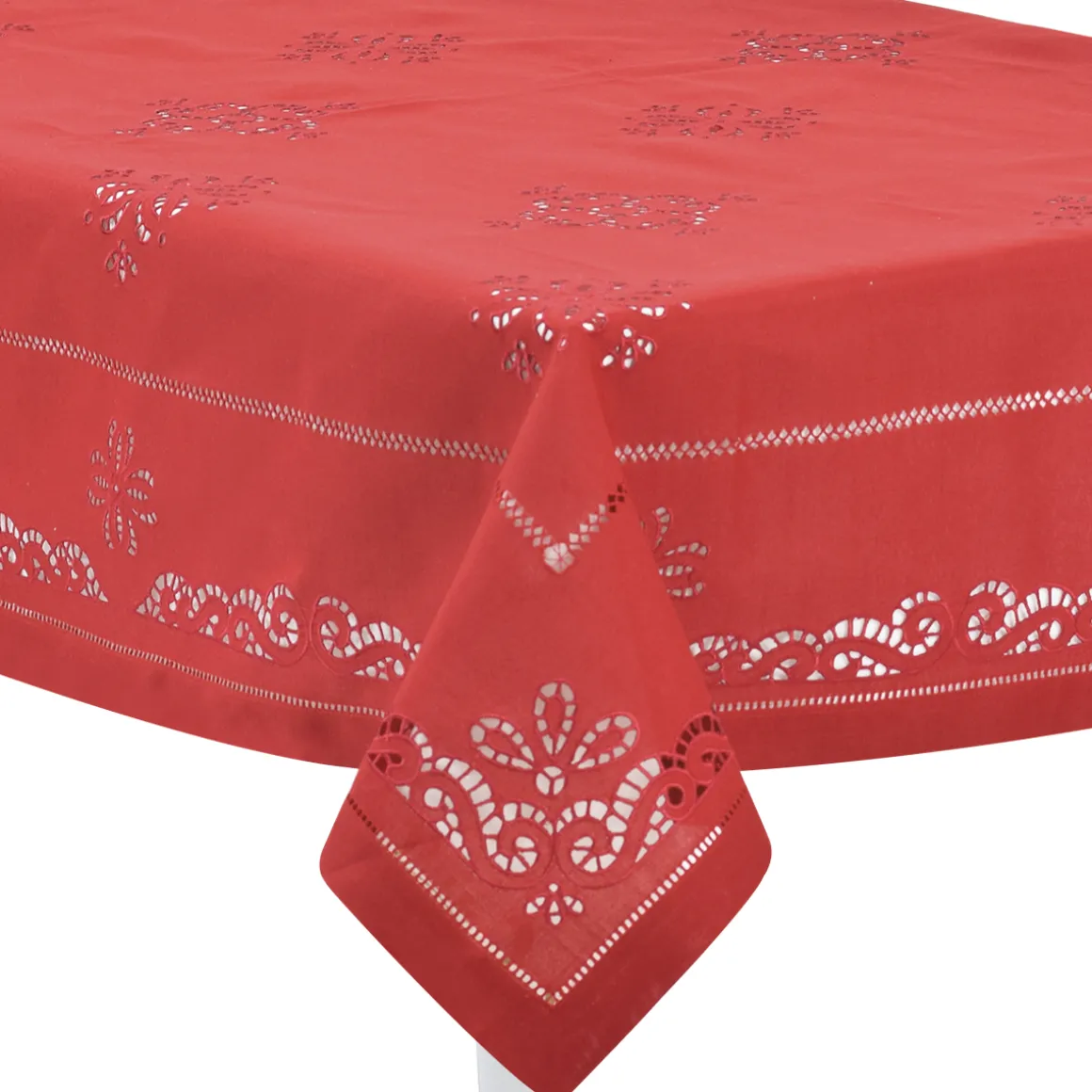 Tovaglia tinta unita rosso con ricamo ad intaglio, punto a giorno e punto gigliuccio . Tovaglia della Christmas Collection di Preziosa Luxury Home , interamente ricamata a mano ,un tocco di classe ed eccellenza per la tua tavola natalizia .